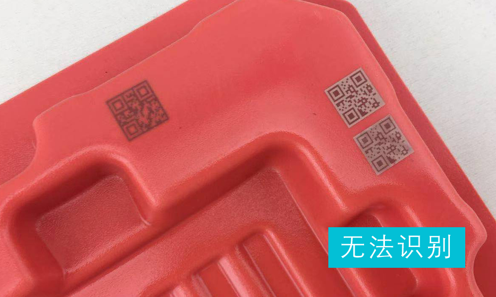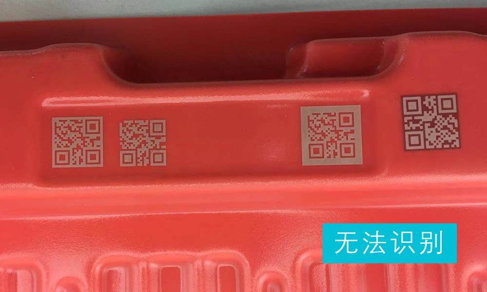 由于吸塑盒為紅色,客戶定義的掃碼槍為霍尼韋爾1900S型號,掃描槍的光源也為紅色,直接雕刻出白色的二維碼也無法識別。解決辦法:先將二維碼打出深度底色,再打出白色的二維碼,即可輕松識別。
